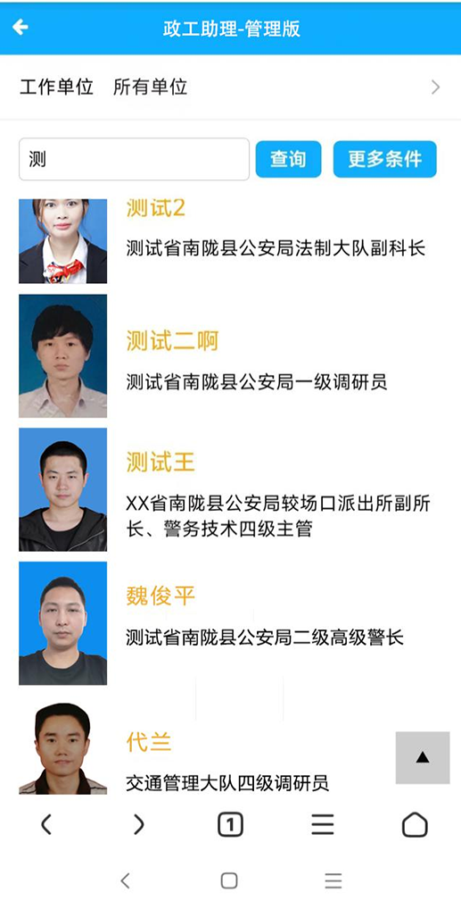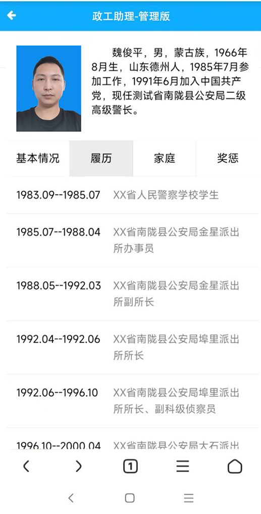 政工助理-管理版是運行在android平板電腦、手機等移動終端上的應用軟件,通過該軟件,各級公安機關領導可以隨時隨地查詢民警的基本情況,以及工作履歷、表彰獎勵、家庭成員等信息,統計分析各級公安機關民警年齡結構、男女比例、學歷層次分布、職務職級等隊伍情況。